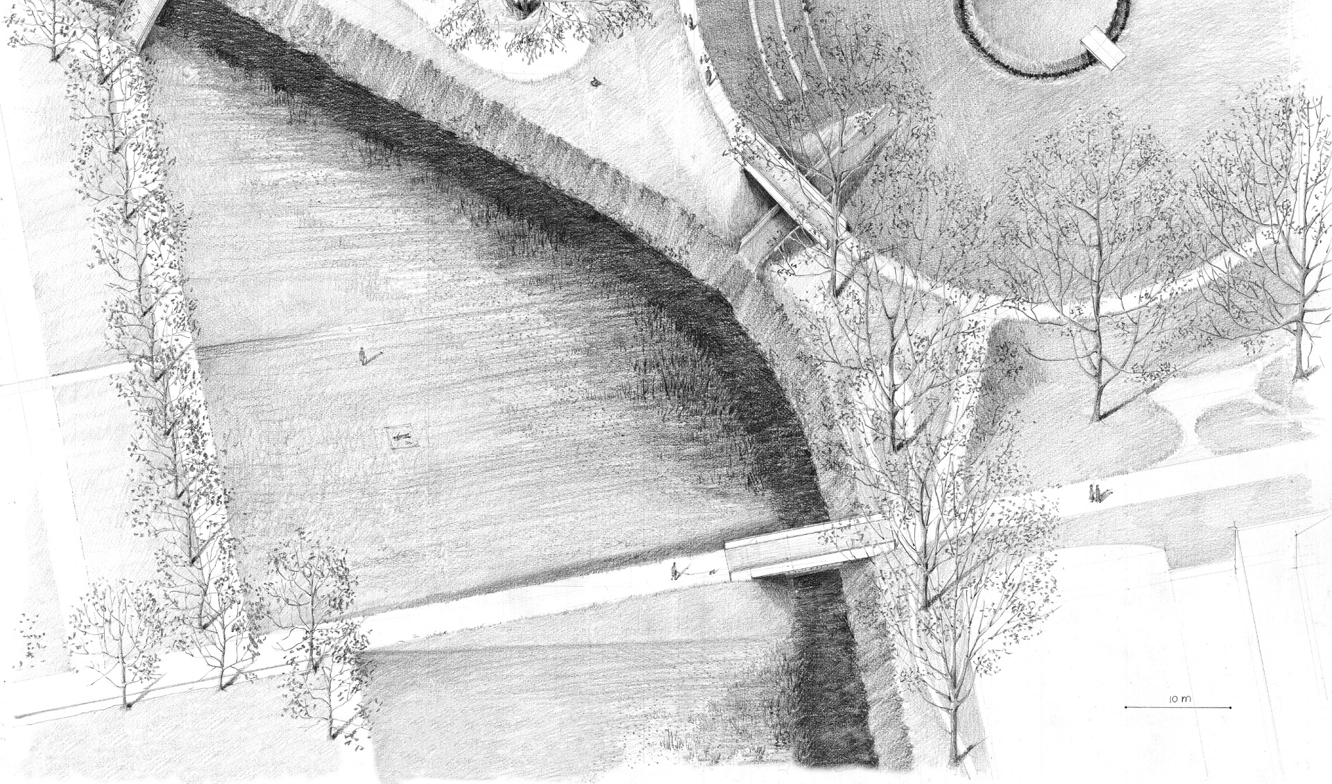 The project is an archipelago of public spaces. It is a system of islands that establishes a new spatial configuration of the landscape, acting in time. The Island of Klybeck re-emerges from the excavation of the filled embankment, creating a park. Nostalgia does not dig out the gravel but the need for a public park which reorientates a new relation to the bathing river. The transformation of the area is carried out as a continuous process: from the establishment of initial favourable conditions by the construction of a structural topographical system, to its gradual shaping by the river flow, with a system of pilings to trap the sediments, favouring the natural growth of the island and creating a riparian ecosystem in a spontaneous process, guided by time. The materials excavated are also reused in a system of public topographies that will articulate the ground floors of the new buildings in the harbour docks, constituting a built archipelago with public and transparent ground floors.