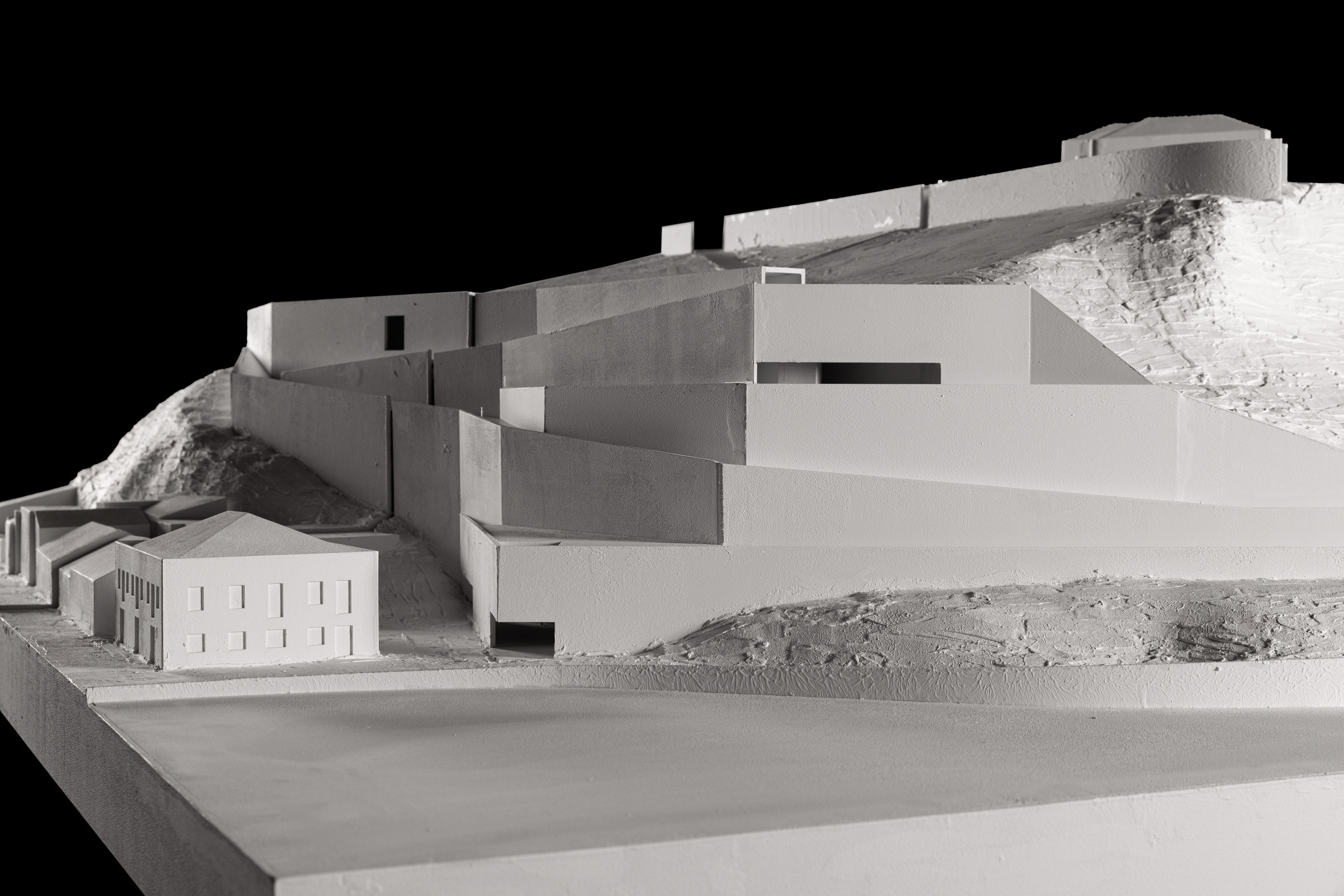 The project is an aqueduct running through Dreispitz; it cools down the district, whilst drawing a pavement along the way. It catches rainwater from the slope of the Bruderholz hill and from the existing water tower on top of it, channels it into the site. The water line flows into a pool and connects a system of fountains in pocket spaces along the Magistrale. It travels through a gutter in the ground, following the slope of the street, ending in the reservoir at the end of Frankfurt-Strasse. A new cistern, in the basement of an existing industrial building, controls the water flow; excess water is directed towards Merian Gardens, flowing into the Birs river. The pool is carved in the ground; long retaining walls draw a descending topography, where landscape is first hidden and then slowly revealed when a wall folds. In the absence of water, it becomes a space reminiscent of a theatre, where the window is the sky, and the city is forgotten. Walking up the bridge-aqueduct, the city becomes visible again.