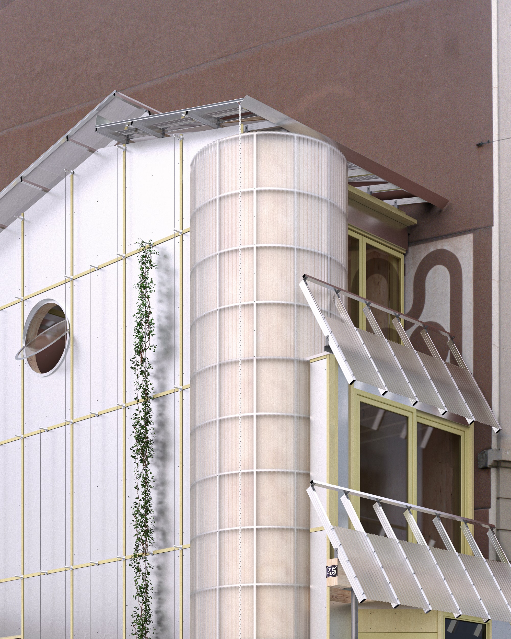 Um den Energieverbrauch im Gebäudesektor zu reduzieren und die aktuelle Wohnungsknappheit zu mildern, wird es immer wichtiger, sich mit den Sanierungen, insbesondere von Fassaden aus den 1960er und 1970er Jahren, zu beschäftigen. Das lineare Anbauen neuer Raumschichten über ganze Fassadenfluchten hinweg schafft neue Raumverbindungen und zeitgemässe Wohntypologien. Neben einer substanziellen energetischen Ertüchtigung entstehen mehr Wohneinheiten mit einer höheren Belegung und weniger Flächenverbrauch pro Kopf. Das klassische Baugerüst, das bei Fassadensanierungen als temporärer Arbeitsraum zum Einsatzkommt, wird zum gestalterischen Ausgangspunkt der eigentlichen Intervention. Der leichte Stahlskelettbau wird mit Windverbänden ausgekreuzt. Der gerüstartige Ausdruck strahlt eine gewisse Leichtigkeit aus und öffnet die Wohnungen zum Landschaftsraum.