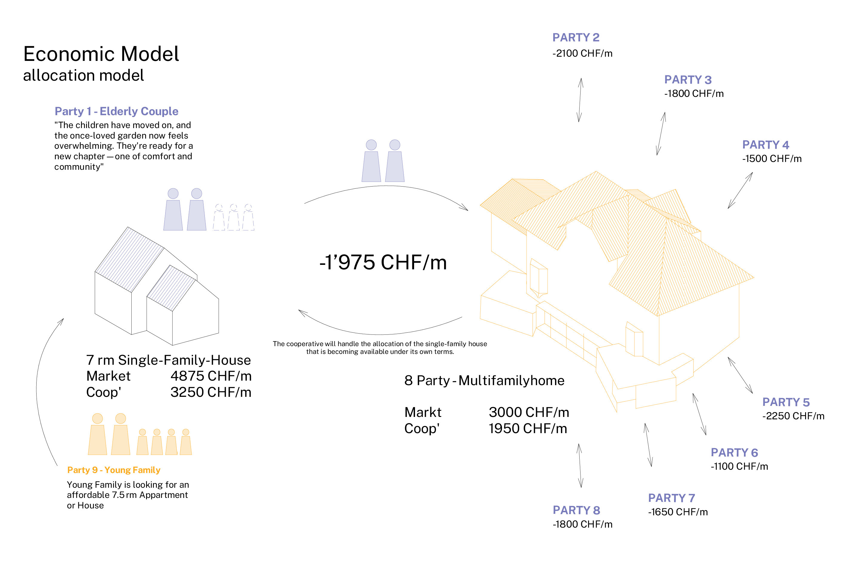 A project surrounding an apartment building in a single-family home neighborhood in Zürich-Höngg. Many single-family homes in Switzerland are structurally contradictory: built for families but increasingly occupied by older people - with a lot of space and unclear prospects. Designed to offer flexibility without radically abandoning ownership, this project is based on two synergistic systems: The existing residential building acts as a counterpart to underoccupied single-family homes in the area. Their owners can move into the shared house while the cooperative makes their single-family homes available to families at low cost. Each apartment is created in close collaboration with the former residents - memories, and atmospheres of the home are interpreted spatially. The cooperative offers a safe option - a way out - when the home no longer suits the stage of life. It respects and transforms histories and property - and tries to create space for others.