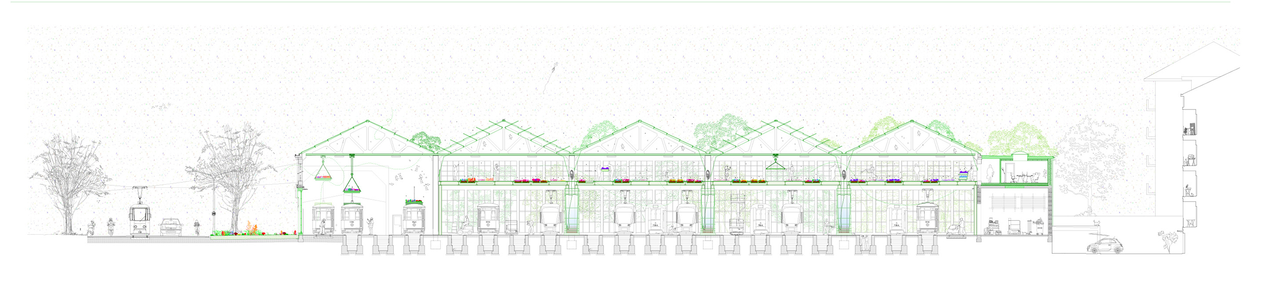 Dans la ville de Milan en Lombardie, plus de mille espèces de fleurs risquent de disparaître. La Eden line est une serre dans un dépôt de tram. Elle insuffle de la vie dans un monde mécanique et permet aux anciens trams de voyager a nouveaux en tant que vecteurs de propagation du pollen des fleurs voie d’extinction. Pour accommoder ces deux mondes, voici les changements effectués. En dehors du bâtiment, les alentours ouest et nord du dépôt deviennent des espaces verts ou les fleurs peuvent s’épanouir. Les façades borgnes et austères, bordant les zones fleuries, se changent en ‘’vitrine’’ du dépôt de tram pour les passants.