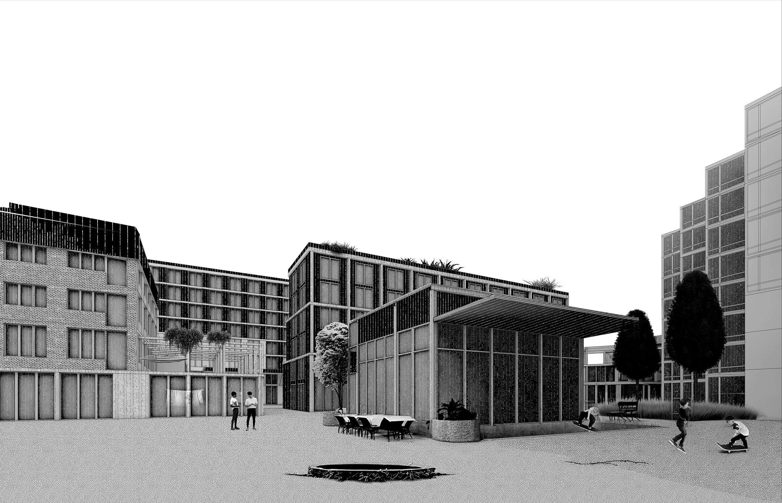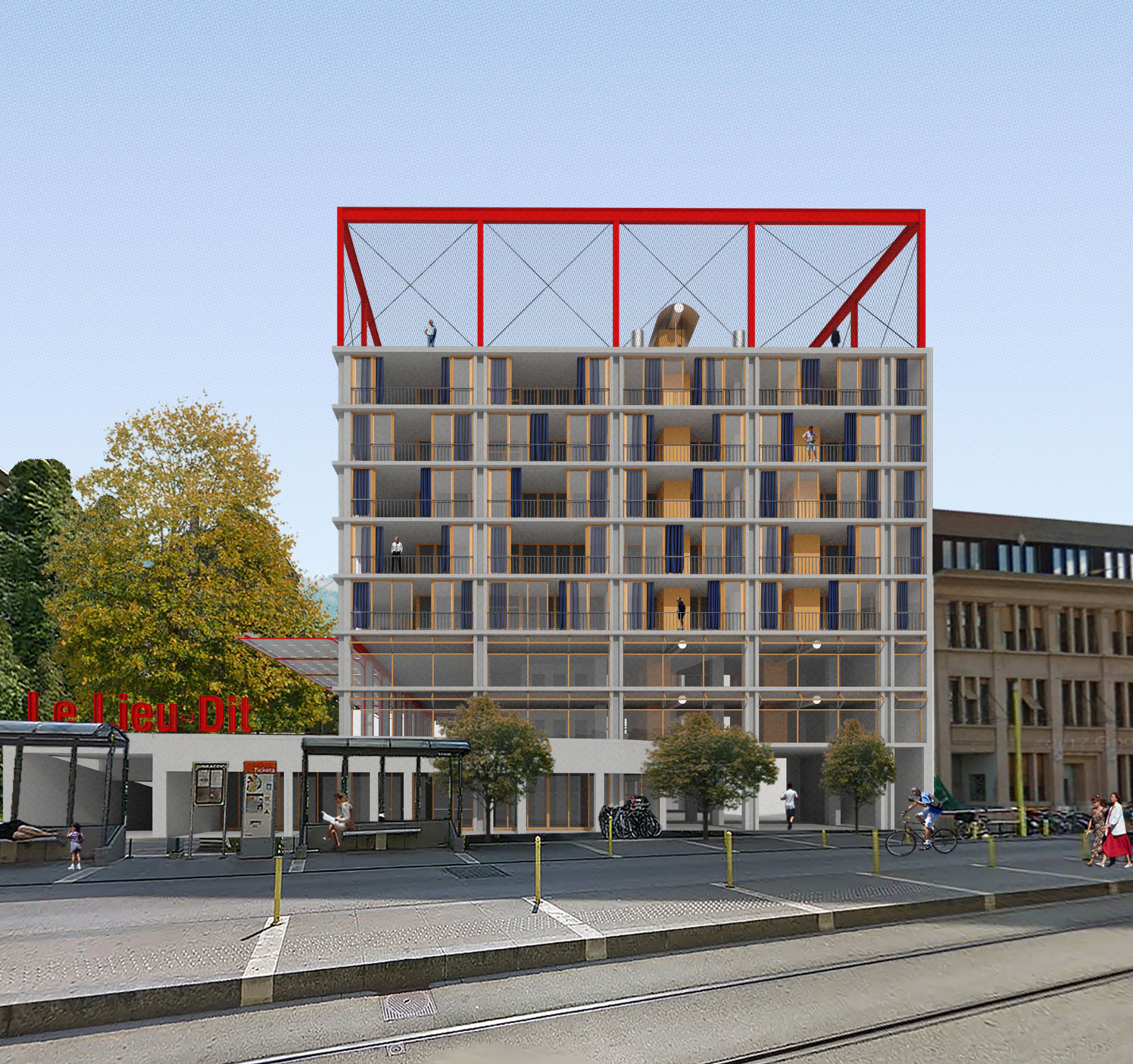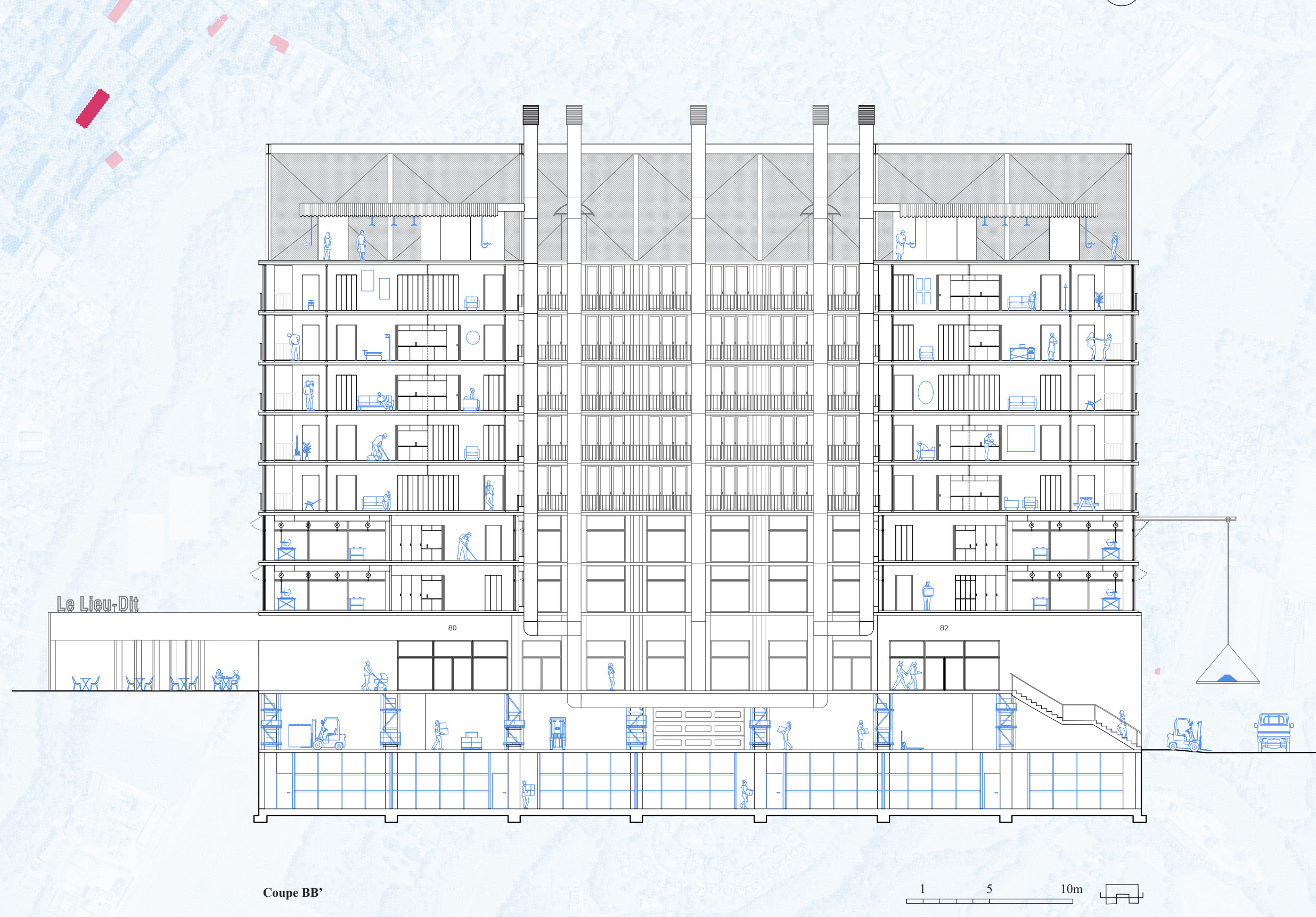 Almost 350,000 m2 of commercial space are empty in the canton of Geneva. Wouldn’t it be urgent to reinvest these vacant spaces and rethink our models of housing accessibility, as well as our ways of conceiving living together on a building and neighborhood scale? Cooperative housing is a popular answer today, and while it offers many advantages, it remains very limited in terms of access, both financially – the price per square meter to invest is now mainly affordable for the middle class – and in terms of physical access to the building for the rest of the neighborhood. This project proposes to rethink living together both inside and outside the building, in order to build a solid, supportive social fabric with minimal intervention on the structure, while allowing for participative construction. In addition to offering communal spaces for residents, the building also features a first floor and roof open to the neighborhood’s remnants. Ideally located close to the station and the city center, it also incorporates workshops to make it a place for professional exchange.