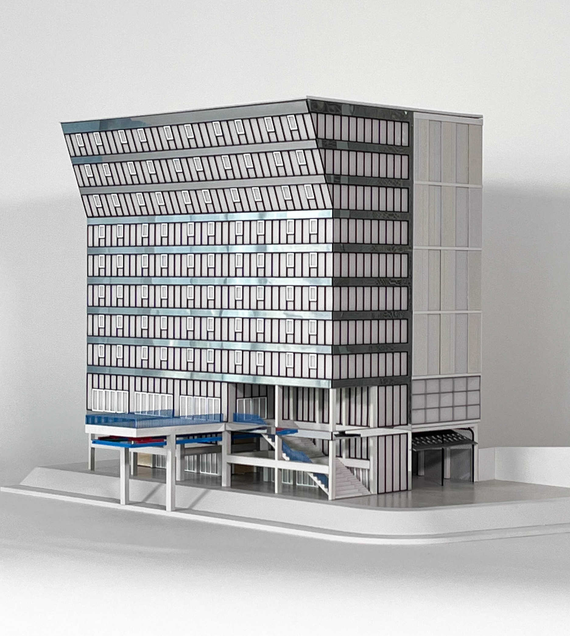 Unique ville Suisse connectée à la mer du Nord par le Rhin, Bâle se situe au cœur de la logistique nationale. En pleine transformation, le port de Bâle-Kleinhüningen, première interface du pays, accueillera dans les prochaines années des milliers de nouveaux logements et emplois avec le déplacement des activités industrielles vers le nord du port, conséquence du projet du nouveau terminal Gateway Basel Nord. En rapprochant sous un même toit la gestion du port, sa capitainerie, un centre de formation pour les métiers de la logistique et du domaine portuaire, ainsi qu'une cantine, le projet favorise les relations et les échanges entre professionnels, apprentis et étudiants. Situé le long du Rhin, face au Dreiländereck – point symbolique de rencontre entre la Suisse, l’Allemagne et la France – le projet se dresse comme un écran à l’échelle des silos qui constituent le paysage industriel des alentours immédiats. Rationnel, le bâtiment se déploie alors en assumant les exigences actuelles du programme tout en anticipant ses besoins futurs. Une desserte verticale relie les halles de production d’un côté, aux salles de classe et bureaux de l’autre via des espaces appropriables. Reprenant l’inclinaison fonctionnelle des fenêtres des timoneries à 18°, la façade de la capitainerie s’ouvre sur le Rhin tout en donnant au bâtiment une image forte et symbolique qui marque cette nouvelle entrée dans la ville comme un signal pour le port.