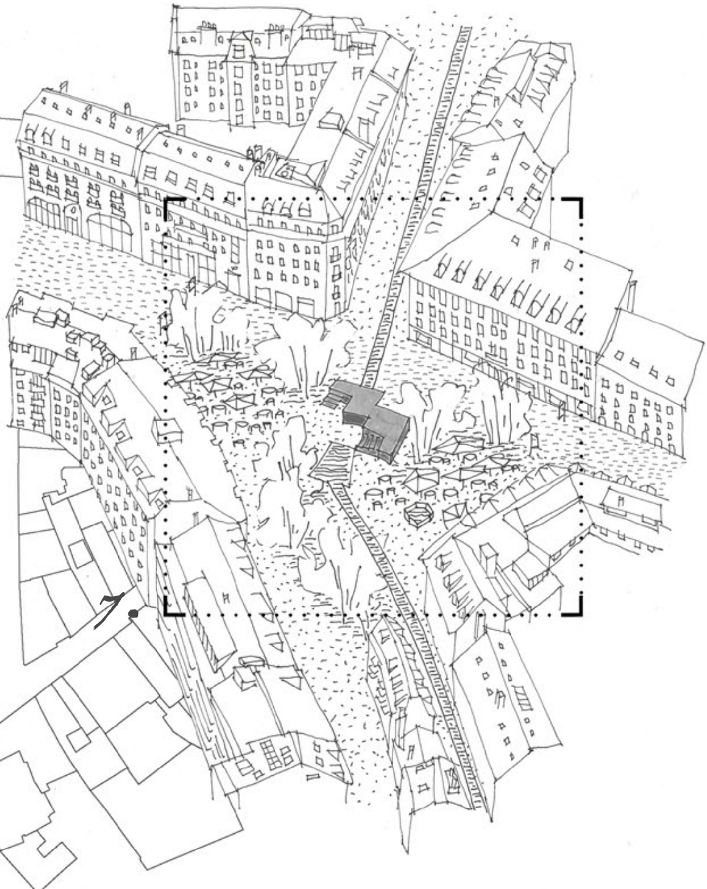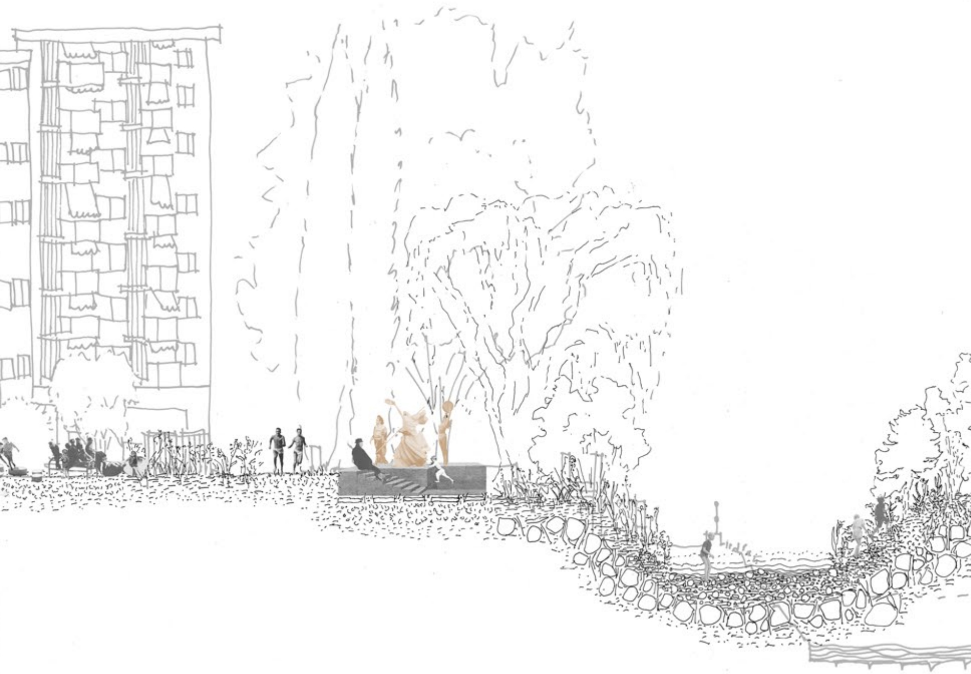 This project questions how to stage movement – and life – in urban space. The project proposes to revitalise the Veveyse torrent by giving it back the unbuilt spaces it used to flow through before industrialisation; by redesigning the branches proper to its morphology, rebuilding the banks that once created different types of relations between water and city, and reopening the Monneresses, two branches that would again serve as urban promenades. The former Veveyse delta is designed as an urban park, capable of supporting different forms of life and connecting different urban tissues. Through a walk from vineyards to lake, the project reinvents the procession that was at the origin of the «Fête des Vignerons» and interprets the idea of Festspiel not only as an event that happens across generations, but as a way of animating everyday stages through movement. The succession of these stages rhythmises the movement along the park and anticipates the steps on the place du Marché, which open onto the water stage and the mountain scene.