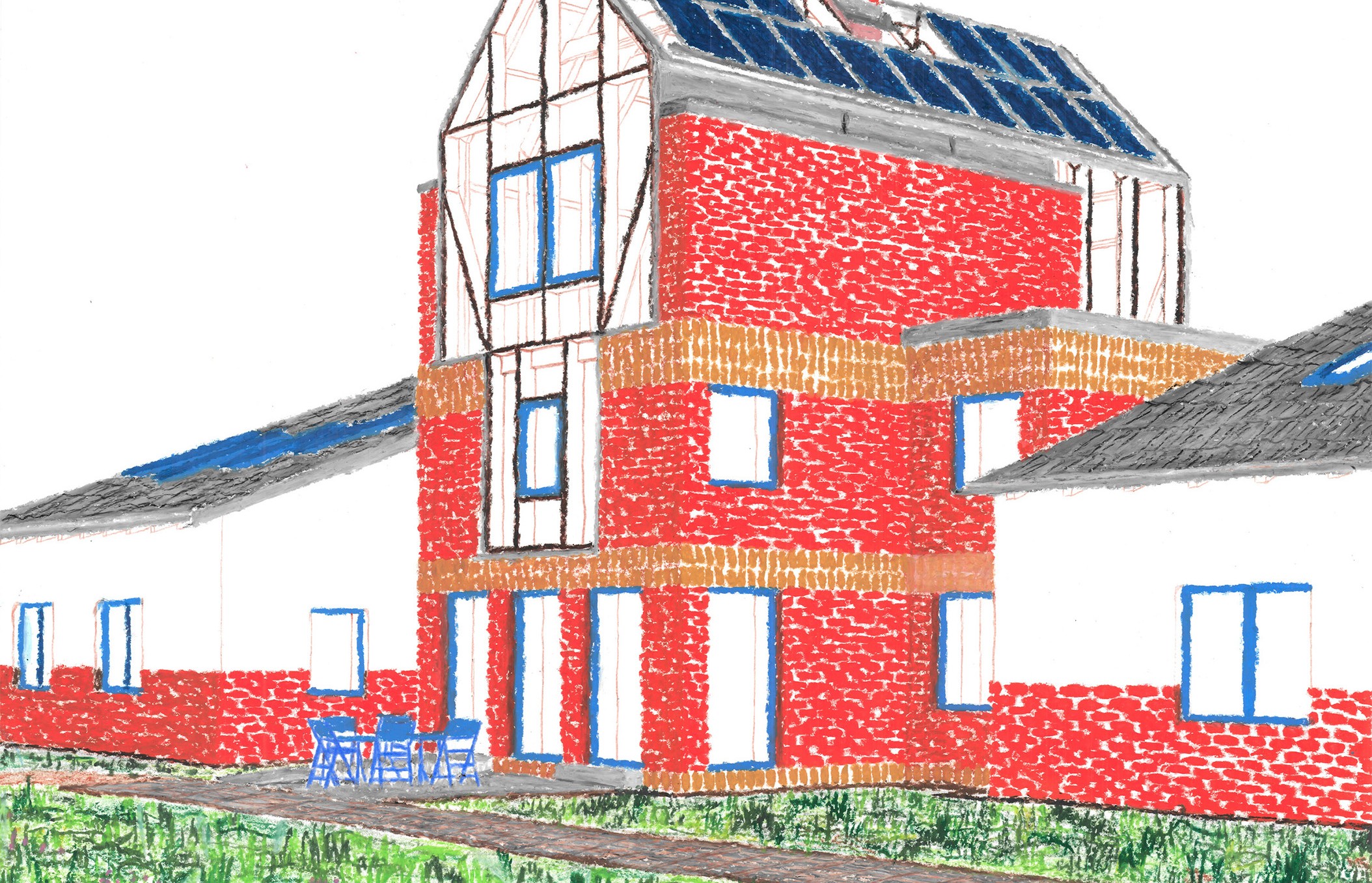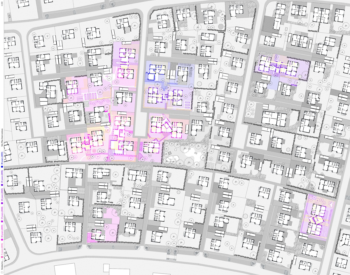 Single-family homes are among the most common domestic architectures in Germany. As a basis for this project, the theoretical statement The Boundaries of Labor which examines domestic space in the crisis of (elderly) care, identifies single-family homes as the place where the current crisis becomes most evident. They conceal the work of (mostly female) caregivers and isolate those that depend on care. Drawing on research and conversations with caregivers, the project proposes scenarios that examine potentials for transformation in a single-family home neighborhood in Borken, Germany, over the next 30 years. Differing in scale, these interventions mean to facilitate social connectivity, mutual aid, civility and adaptability for changing life circumstances of the residents. The aim is to create an architecture which considers the (affective) relations that residents form with their surroundings—by fostering social and cultural acceptance as well as an increased visibility of aging.
