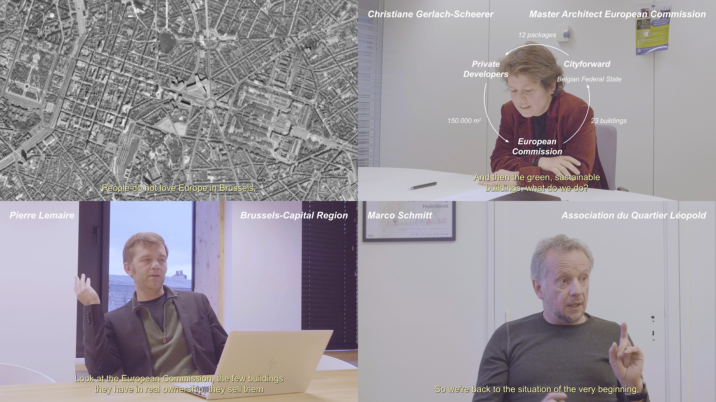 In summer 2023, the European Commission announced the biggest single real estate operation in the history of Brussels: to sell 50% of its buildings. In order to achieve the goal for climate neutrality by 2030, the EC is in fact abandoning their allegedly «underperforming» building stock, bundled in one portfolio of 350.000 m². Ode to Joy proposes an alternative to the commercialization of institutional space by implementing a leasehold system for the sales process: The state gets to keep the land while dwellers will own their homes just the EC will own its offices. The plotting of commercial against social function is turned around. Focusing on îlot 130, a building block at the intersection of the residential and institutional axis of the European quarter, the programme combines the offices of the institution with dwellings and the Brussels Centre for Urban Studies. Office space is reduced to 50%, creating over 30% housing, most of which is far below market price.