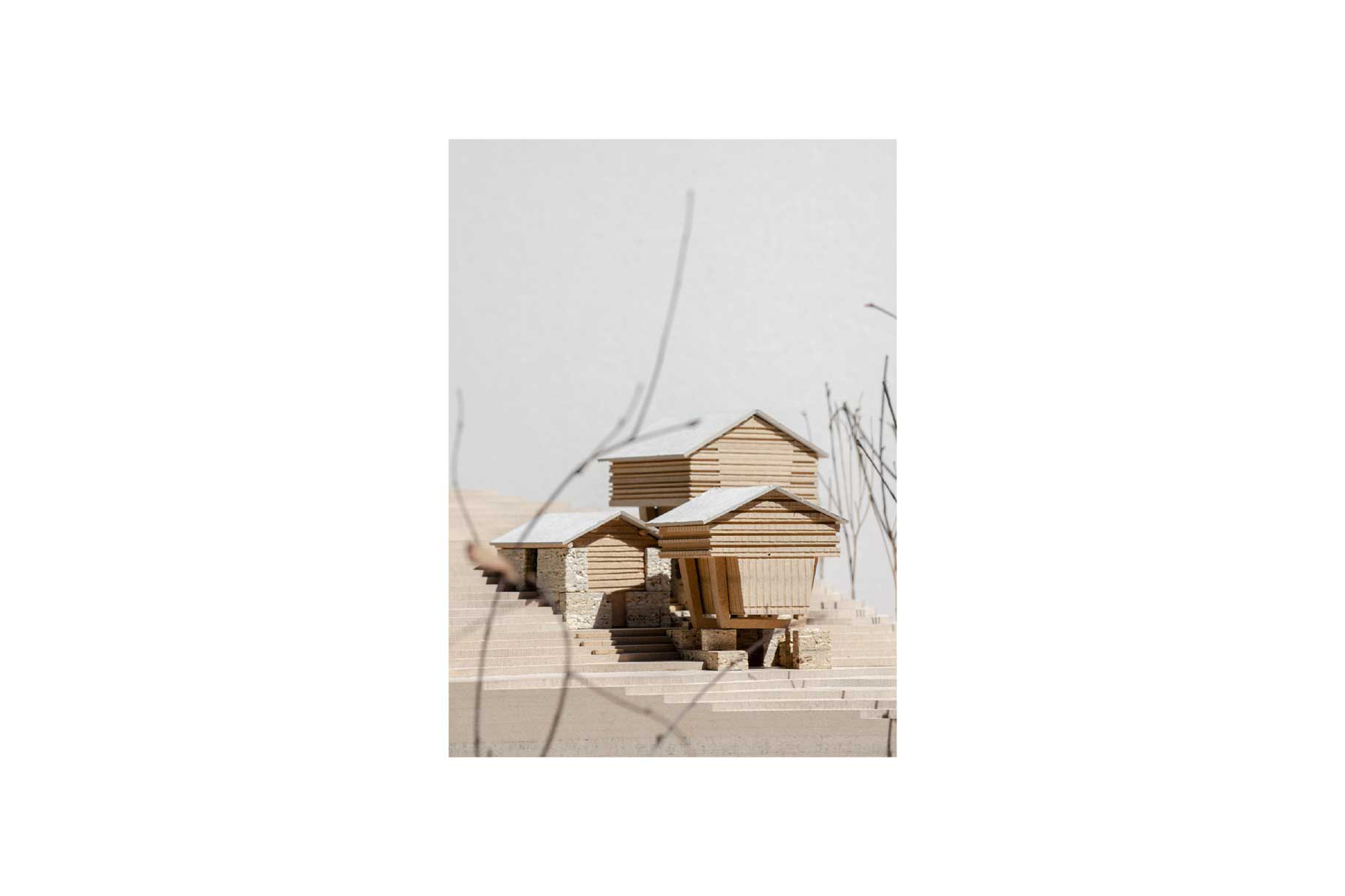 Aufbauend auf den Fussabdrücken ruinöser Stallscheunen nimmt das Ensemble Bezug zur früheren Konglomeratsstellung der Bauten. Die Höhe des neuen Rifugios definiert sich durch die Masseinheiten der wiederverwendeten Skimasten und markiert gleichsam die gemeinschaftlich-öffentliche Nutzung der Kastanienverarbeitung.