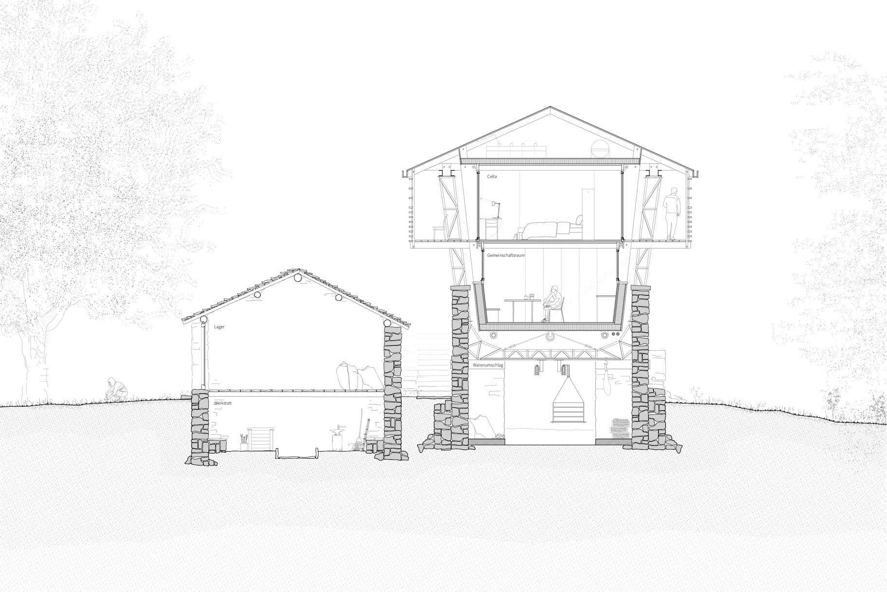 Das Erdgeschoss im Rifugio am Mont Grand widmet sich der Kastanienverarbeitung. So befindet sich unter dem Refugio der Umschlag der neuen Materialseilbahn, die die neue Bewirtschaftung des Kulturlands am Mont Grand sichern soll. Darüber, eingehängt in den ehemaligen Portalmasten, befindet sich das Refugio mit Gemeinschaftsraum, Küche und einfachen Schlafzellen als Rückzugsmöglichkeit.