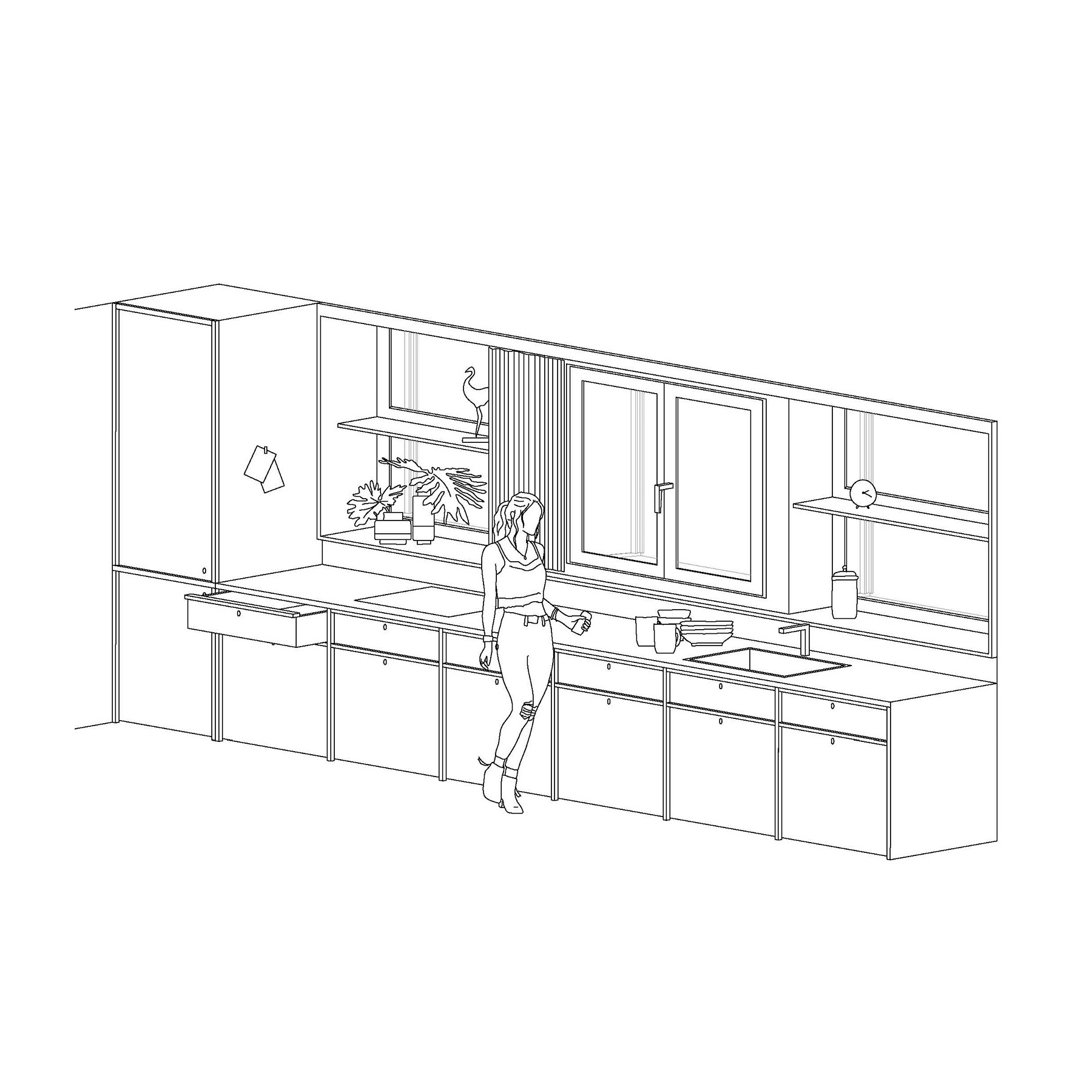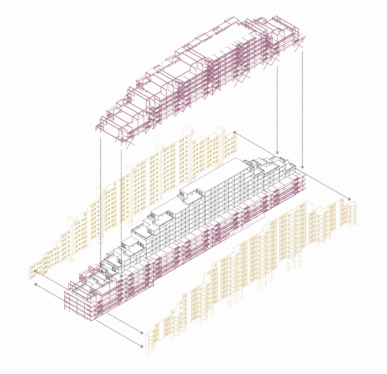 Um den Energieverbrauch im Gebäudesektor zu reduzieren und die aktuelle Wohnungsknappheit zu mildern, wird es immer wichtiger, sich mit den Sanierungen, insbesondere von Fassaden aus den 1960er und 1970er Jahren, zu beschäftigen. Das lineare Anbauen neuer Raumschichten über ganze Fassadenfluchten hinweg schafft neue Raumverbindungen und zeitgemässe Wohntypologien. Neben einer substanziellen energetischen Ertüchtigung entstehen mehr Wohneinheiten mit einer höheren Belegung und weniger Flächenverbrauch pro Kopf. Das klassische Baugerüst, das bei Fassadensanierungen als temporärer Arbeitsraum zum Einsatzkommt, wird zum gestalterischen Ausgangspunkt der eigentlichen Intervention. Der leichte Stahlskelettbau wird mit Windverbänden ausgekreuzt. Der gerüstartige Ausdruck strahlt eine gewisse Leichtigkeit aus und öffnet die Wohnungen zum Landschaftsraum.