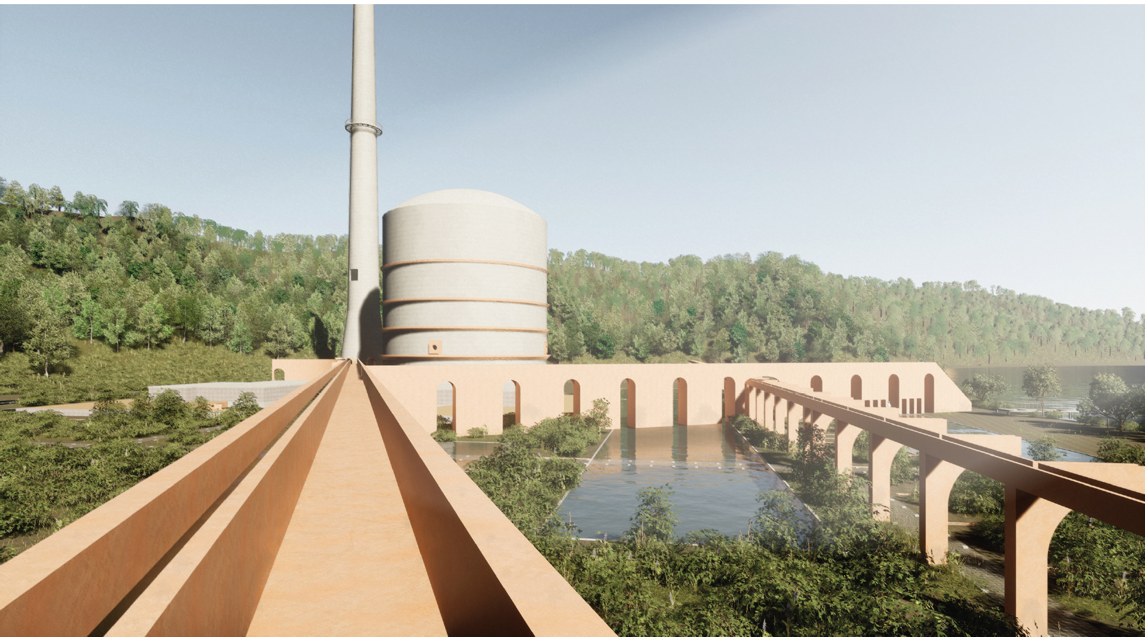20. Dezember 2019: In Mühleberg wird das erste Schweizer Kernkraftwerk stillgelegt. Ab 2031 soll das Areal zum Rückbau freigegeben werden, doch für die zukünftige Nutzung fehlen bislang öffentlichen Studien. Das Projekt zeigt eine Intervention, die verhindert, dass alles abgerissen und aus dem Gedächtnis getilgt wird. Die Ruine wird zu einem Ort, wo die Geschichte der Kernkraft und der Gesellschaftswandel für kommende Generationen greifbar bleibt. Das Reaktorgebäude wird zu einem Bad umgebaut, das den Raum körperlich erfahrbar macht. Der Hochkamin wird Treffpunkt und Museum, kann aber auch von Fledermäusen genutzt werden. Der restliche Teil des Areals wird als Flussbad genutzt oder renaturiert. Die Gebäudeabdrücke werden zu metaphysischen Objekten in einem Landschaftspark mit wilder Sukzessionsnatur. Verbunden werden die verschiedenen Orte durch eine horizontale, massstabslose Grossstruktur, die an den römischen Aquädukt, den Hochkamin und das Reaktorgebäude anknüpft.